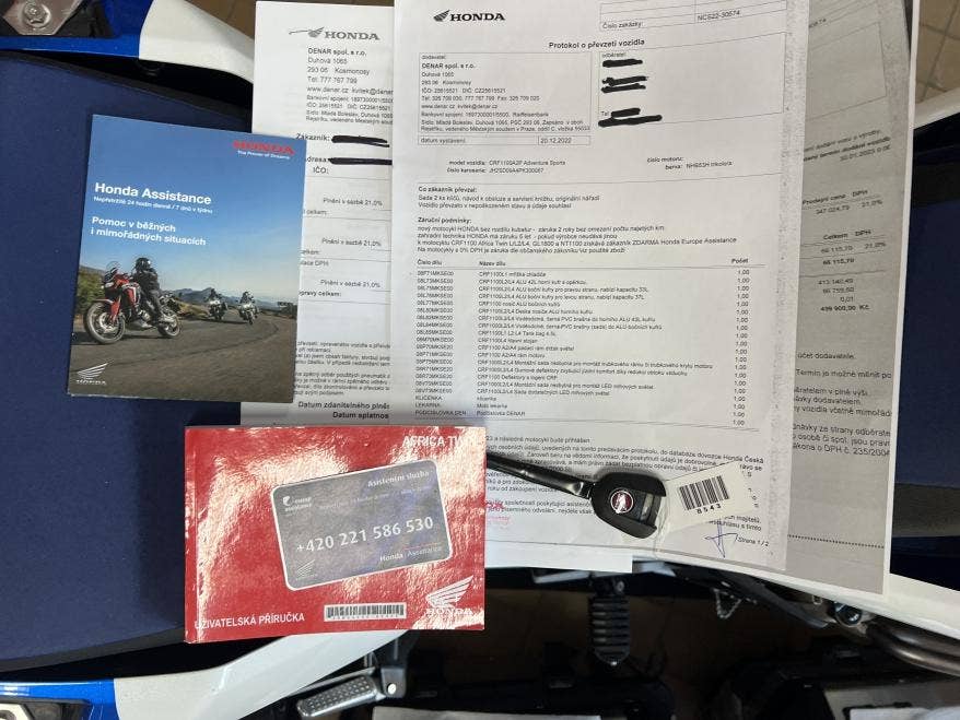 1. majitel koupeno nové v CZ Honda DENAR za cenu 499 900,, téměř nejetá, nevyužitá, na majitele byla příliš vysoká, nyní u nás měnil za menší moto, stav nové motorky bez oděrky, orig. výbava vše Honda: vrchní + spodní padací rámy + přídavná LED světla, držáky + 3x alu kufry včetně vnitřních tašek, Tank bag na nádrž, hlavní stojan, doplňkové deflektory, mřížky chladičů, vše doloženo nákupní fakturou + fakturou za první servis v 800 km v ceně 4500,, STK do 01/2029